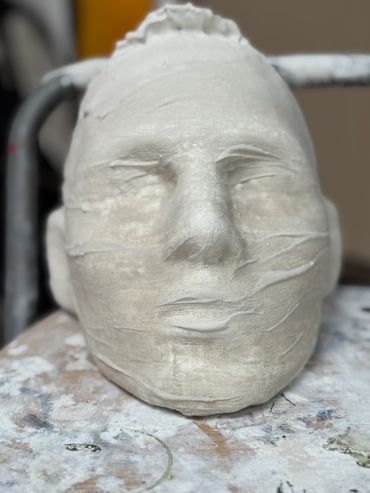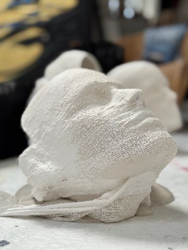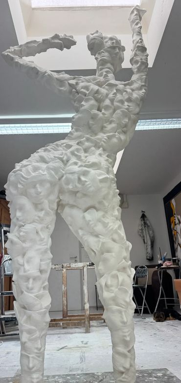 Formation aus 500 Masken, die Skulptur ist 250 cm hoch und heisst "Masken-Frau" und wird in Bronze gegossen, in der Kunstgiesserei Bruendler Winterthur. Ein Herzstueck entsteht mit hohem Wert.